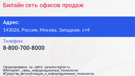 Билайн, сеть офисов продаж по адресу 143026, Россия, Москва, Западная, ст4 в дальнейшем Организация, размещена в следующих категориях: