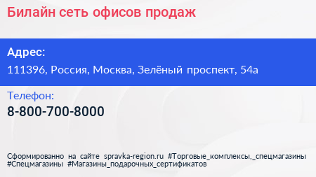 Билайн, сеть офисов продаж по адресу 111396, Россия, Москва, Зелёный проспект, 54а в дальнейшем Организация, размещена в следующих категориях: