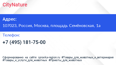 CityNature по адресу 107023, Россия, Москва, площадь Семёновская, 1а в дальнейшем Организация, размещена в следующих категориях: