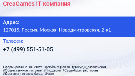 CreaGames, IT-компания по адресу 127015, Россия, Москва, Новодмитровская, 2 к1 в дальнейшем Организация, размещена в следующих категориях: