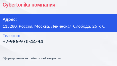 Cybertonika, компания по адресу 115280, Россия, Москва, Ленинская Слобода, 26 к C в дальнейшем Организация, размещена в следующих категориях: