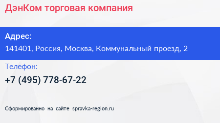 ДэнКом, торговая компания по адресу 141401, Россия, Москва, Коммунальный проезд, 2 в дальнейшем Организация, размещена в следующих категориях: