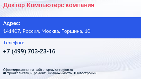 Доктор Компьютерс, компания по адресу 141407, Россия, Москва, Горшина, 10 в дальнейшем Организация, размещена в следующих категориях: