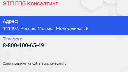 ЭТП ГПБ Консалтинг по адресу 141407, Россия, Москва, Молодёжная, 8 в дальнейшем Организация, размещена в следующих категориях: