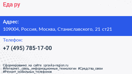 Еда.ру по адресу 109004, Россия, Москва, Станиславского, 21 ст21 в дальнейшем Организация, размещена в следующих категориях: