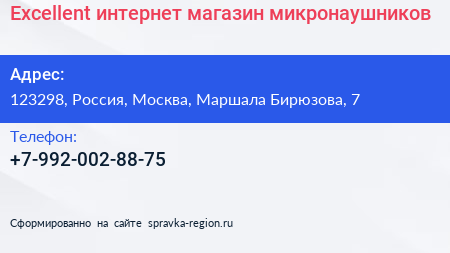 Excellent, интернет-магазин микронаушников по адресу 123298, Россия, Москва, Маршала Бирюзова, 7 в дальнейшем Организация, размещена в следующих категориях: