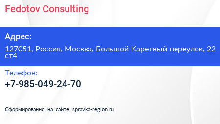 Fedotov Consulting по адресу 127051, Россия, Москва, Большой Каретный переулок, 22 ст4 в дальнейшем Организация, размещена в следующих категориях: