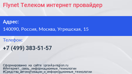 Flynet Телеком, интернет-провайдер по адресу 140090, Россия, Москва, Угрешская, 15 в дальнейшем Организация, размещена в следующих категориях: