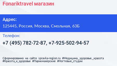 Fonariktravel, магазин по адресу 125445, Россия, Москва, Смольная, 63Б в дальнейшем Организация, размещена в следующих категориях: