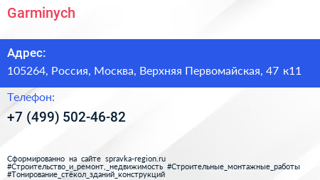 Garminych по адресу 105264, Россия, Москва, Верхняя Первомайская, 47 к11 в дальнейшем Организация, размещена в следующих категориях: