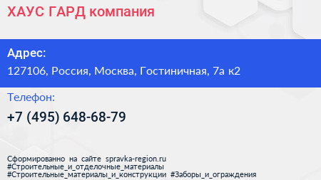 ХАУС ГАРД, компания по адресу 127106, Россия, Москва, Гостиничная, 7а к2 в дальнейшем Организация, размещена в следующих категориях: