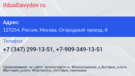 IldusDavydov.ru по адресу 127254, Россия, Москва, Огородный проезд, 8 в дальнейшем Организация, размещена в следующих категориях: