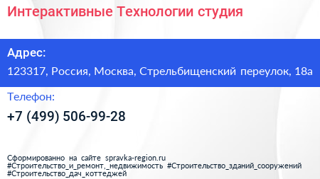 Интерактивные Технологии, студия по адресу 123317, Россия, Москва, Стрельбищенский переулок, 18а в дальнейшем Организация, размещена в следующих категориях: