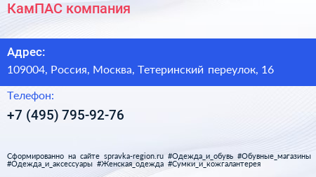 КамПАС, компания по адресу 109004, Россия, Москва, Тетеринский переулок, 16 в дальнейшем Организация, размещена в следующих категориях: