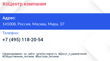 КоЦентр, компания по адресу 141008, Россия, Москва, Мира, 37 в дальнейшем Организация, размещена в следующих категориях: