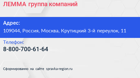 ЛЕММА, группа компаний по адресу 109044, Россия, Москва, Крутицкий 3-й переулок, 11 в дальнейшем Организация, размещена в следующих категориях: