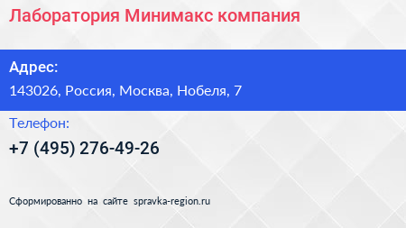 Лаборатория Минимакс, компания по адресу 143026, Россия, Москва, Нобеля, 7 в дальнейшем Организация, размещена в следующих категориях: