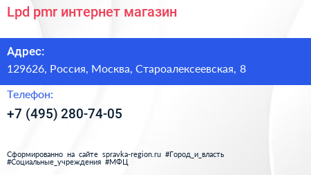 Lpd-pmr, интернет-магазин по адресу 129626, Россия, Москва, Староалексеевская, 8 в дальнейшем Организация, размещена в следующих категориях: