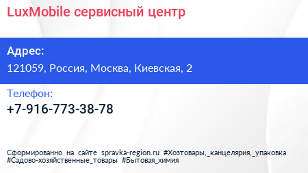 LuxMobile, сервисный центр по адресу 121059, Россия, Москва, Киевская, 2 в дальнейшем Организация, размещена в следующих категориях:
