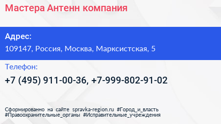 Мастера Антенн, компания по адресу 109147, Россия, Москва, Марксистская, 5 в дальнейшем Организация, размещена в следующих категориях: