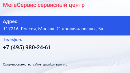 МегаСервис, сервисный центр по адресу 117216, Россия, Москва, Старокачаловская, 5а в дальнейшем Организация, размещена в следующих категориях: