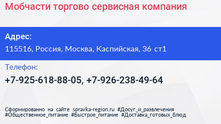 Мобчасти, торгово-сервисная компания по адресу 115516, Россия, Москва, Каспийская, 36 ст1 в дальнейшем Организация, размещена в следующих категориях:
