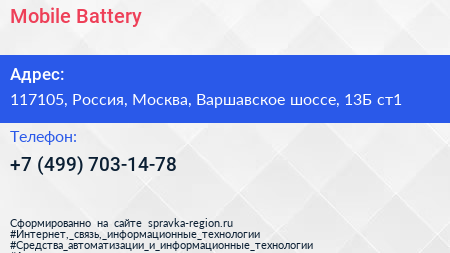 Mobile Battery по адресу 117105, Россия, Москва, Варшавское шоссе, 13Б ст1 в дальнейшем Организация, размещена в следующих категориях: