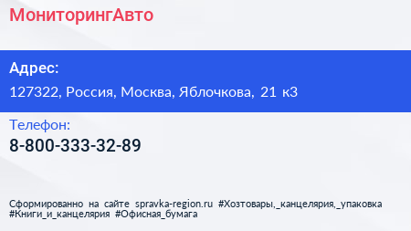 МониторингАвто по адресу 127322, Россия, Москва, Яблочкова, 21 к3 в дальнейшем Организация, размещена в следующих категориях: