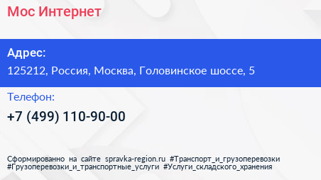 Мос Интернет по адресу 125212, Россия, Москва, Головинское шоссе, 5 в дальнейшем Организация, размещена в следующих категориях: