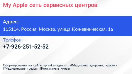 My Apple, сеть сервисных центров по адресу 115114, Россия, Москва, улица Кожевническая, 1а в дальнейшем Организация, размещена в следующих категориях: