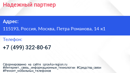 Надежный партнер по адресу 115193, Россия, Москва, Петра Романова, 14 к1 в дальнейшем Организация, размещена в следующих категориях: