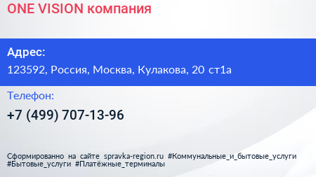 ONE-VISION, компания по адресу 123592, Россия, Москва, Кулакова, 20 ст1а в дальнейшем Организация, размещена в следующих категориях: