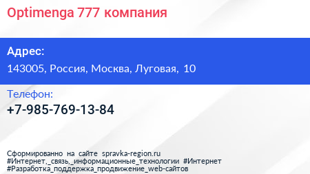 Optimenga 777, компания по адресу 143005, Россия, Москва, Луговая, 10 в дальнейшем Организация, размещена в следующих категориях: