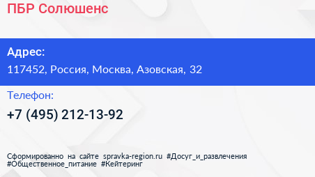 ПБР Солюшенс по адресу 117452, Россия, Москва, Азовская, 32 в дальнейшем Организация, размещена в следующих категориях: