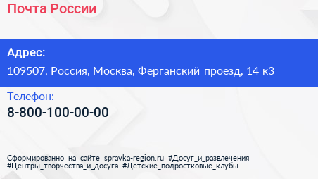 Почта России по адресу 109507, Россия, Москва, Ферганский проезд, 14 к3 в дальнейшем Организация, размещена в следующих категориях: