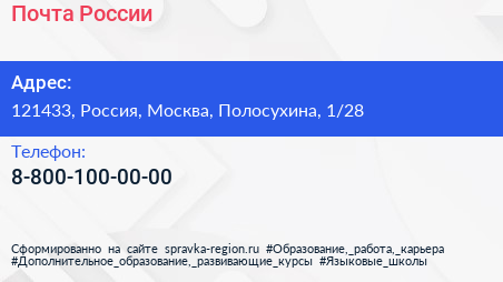 Почта России по адресу 121433, Россия, Москва, Полосухина, 1/28 в дальнейшем Организация, размещена в следующих категориях: