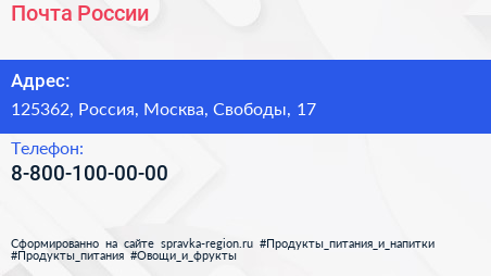 Почта России по адресу 125362, Россия, Москва, Свободы, 17 в дальнейшем Организация, размещена в следующих категориях: