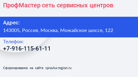 ПрофМастер, сеть сервисных центров по адресу 143005, Россия, Москва, Можайское шоссе, 122 в дальнейшем Организация, размещена в следующих категориях: