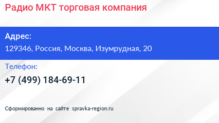 Радио-МКТ, торговая компания по адресу 129346, Россия, Москва, Изумрудная, 20 в дальнейшем Организация, размещена в следующих категориях: