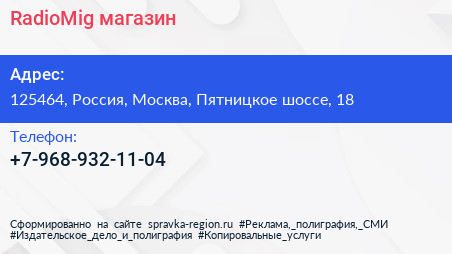 RadioMig, магазин по адресу 125464, Россия, Москва, Пятницкое шоссе, 18 в дальнейшем Организация, размещена в следующих категориях: