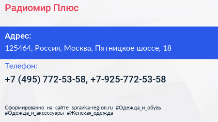Радиомир Плюс по адресу 125464, Россия, Москва, Пятницкое шоссе, 18 в дальнейшем Организация, размещена в следующих категориях:
