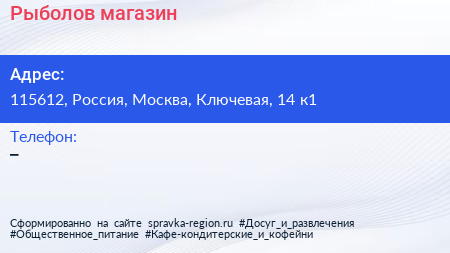 Рыболов, магазин по адресу 115612, Россия, Москва, Ключевая, 14 к1 в дальнейшем Организация, размещена в следующих категориях: