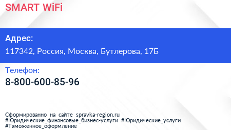 SMART-WiFi по адресу 117342, Россия, Москва, Бутлерова, 17Б в дальнейшем Организация, размещена в следующих категориях: