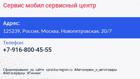 Сервис мобил, сервисный центр по адресу 125239, Россия, Москва, Новопетровская, 20/7 в дальнейшем Организация, размещена в следующих категориях: