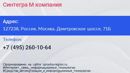 Синтегра-М, компания по адресу 127238, Россия, Москва, Дмитровское шоссе, 71Б в дальнейшем Организация, размещена в следующих категориях: