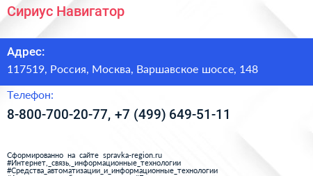 Сириус Навигатор по адресу 117519, Россия, Москва, Варшавское шоссе, 148 в дальнейшем Организация, размещена в следующих категориях: