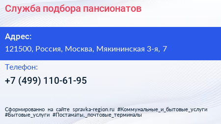 Служба подбора пансионатов по адресу 121500, Россия, Москва, Мякининская 3-я, 7 в дальнейшем Организация, размещена в следующих категориях: