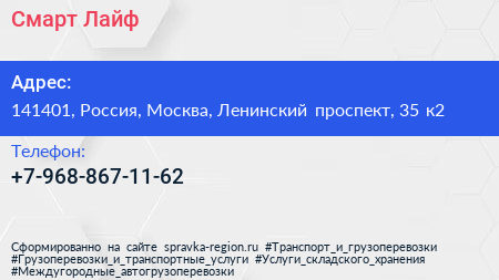Смарт Лайф по адресу 141401, Россия, Москва, Ленинский проспект, 35 к2 в дальнейшем Организация, размещена в следующих категориях: