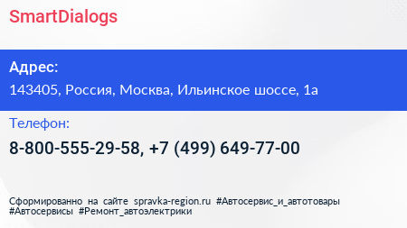 SmartDialogs по адресу 143405, Россия, Москва, Ильинское шоссе, 1а в дальнейшем Организация, размещена в следующих категориях: