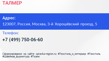 ТАЛМЕР по адресу 123007, Россия, Москва, 3-й Хорошёвский проезд, 5 в дальнейшем Организация, размещена в следующих категориях: